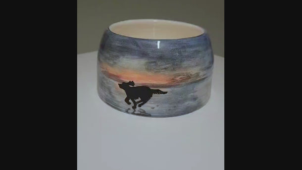 On one side, a cocker spaniel sits at the shoreline, watching seagulls flying in the distance (the profile is taken from Mango who often sits like this at the studio door, watching the pigeons). Turn the bowl, and there he is again — running free on the wet sand against the sunset, ears flying, utterly alive.