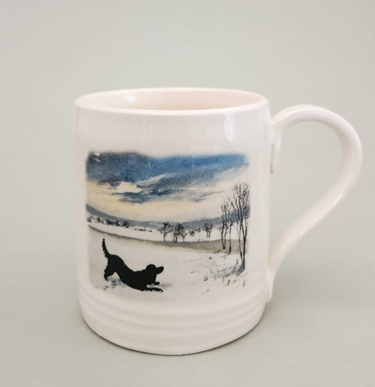 Frosty air, joyful play. This handmade mug shows a spaniel play bowing in a snowy landscape, taken from my original design. It’s the perfect mug for a steaming hot chocolate on a wintry day, post walkies.