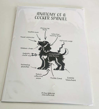 Featuring digital artwork by Claire Pearson-Cowell, this delightful print sums up cocker spaniels perfectly!