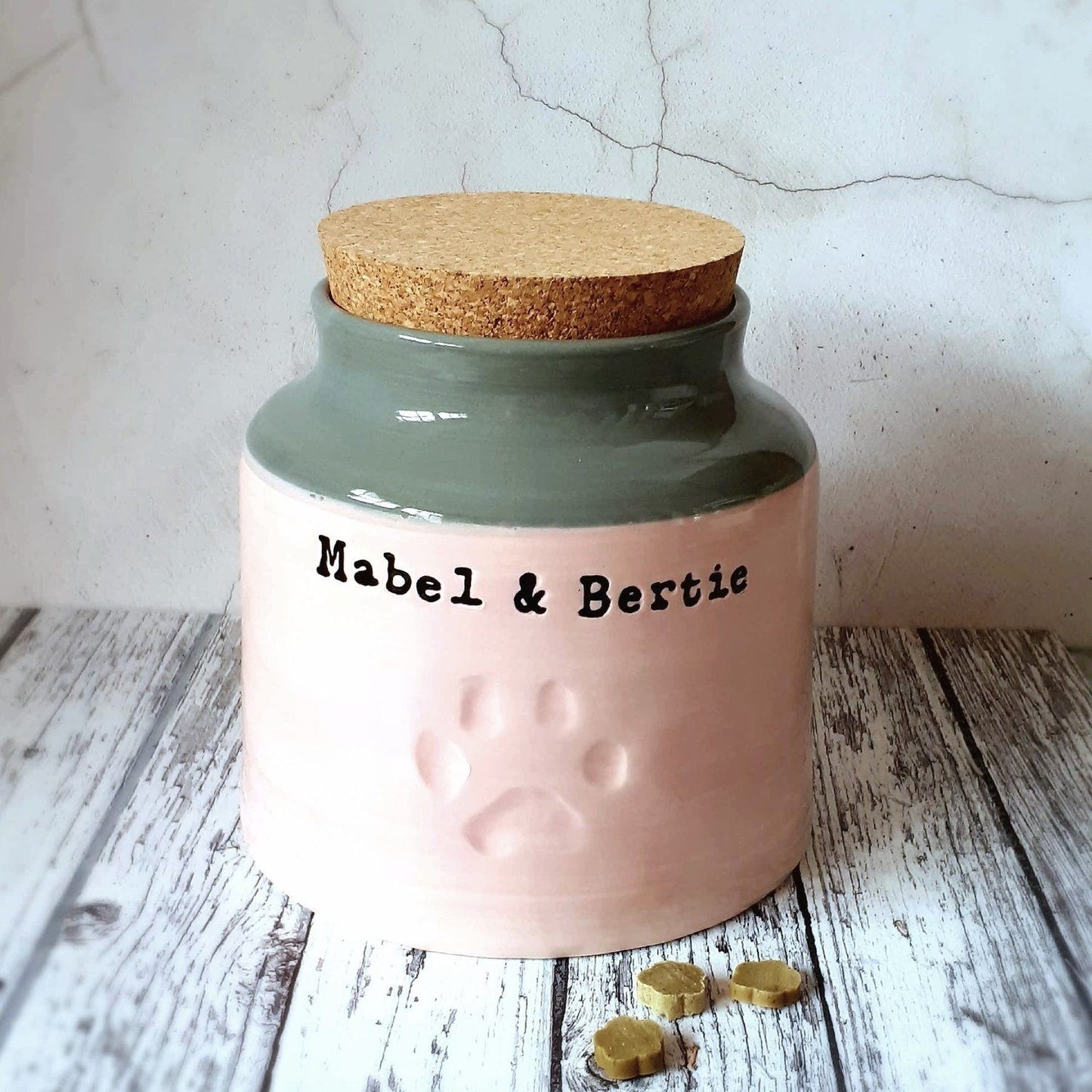 Our chunky ceramic treat jar is a stylish, durable upgrade that stores your pup’s snacks in style. Made by me in Hampshire and glazed to enhance your kitchen decor, it comes with a snug cork lid to keep treats fresh and chew-ready.