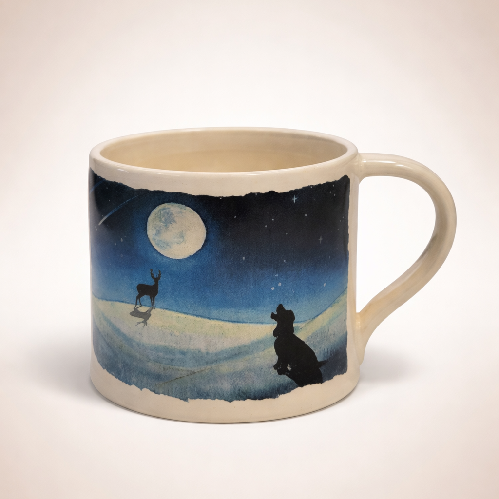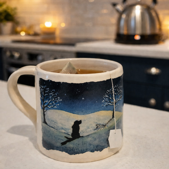 The mug is thrown by hand in Hampshire, and the artwork is transferred from an original painting — my own. It's the detail that makes it: the depth of the night sky, the stillness of the landscape, the sense that your dog would absolutely be out there given half a chance.
